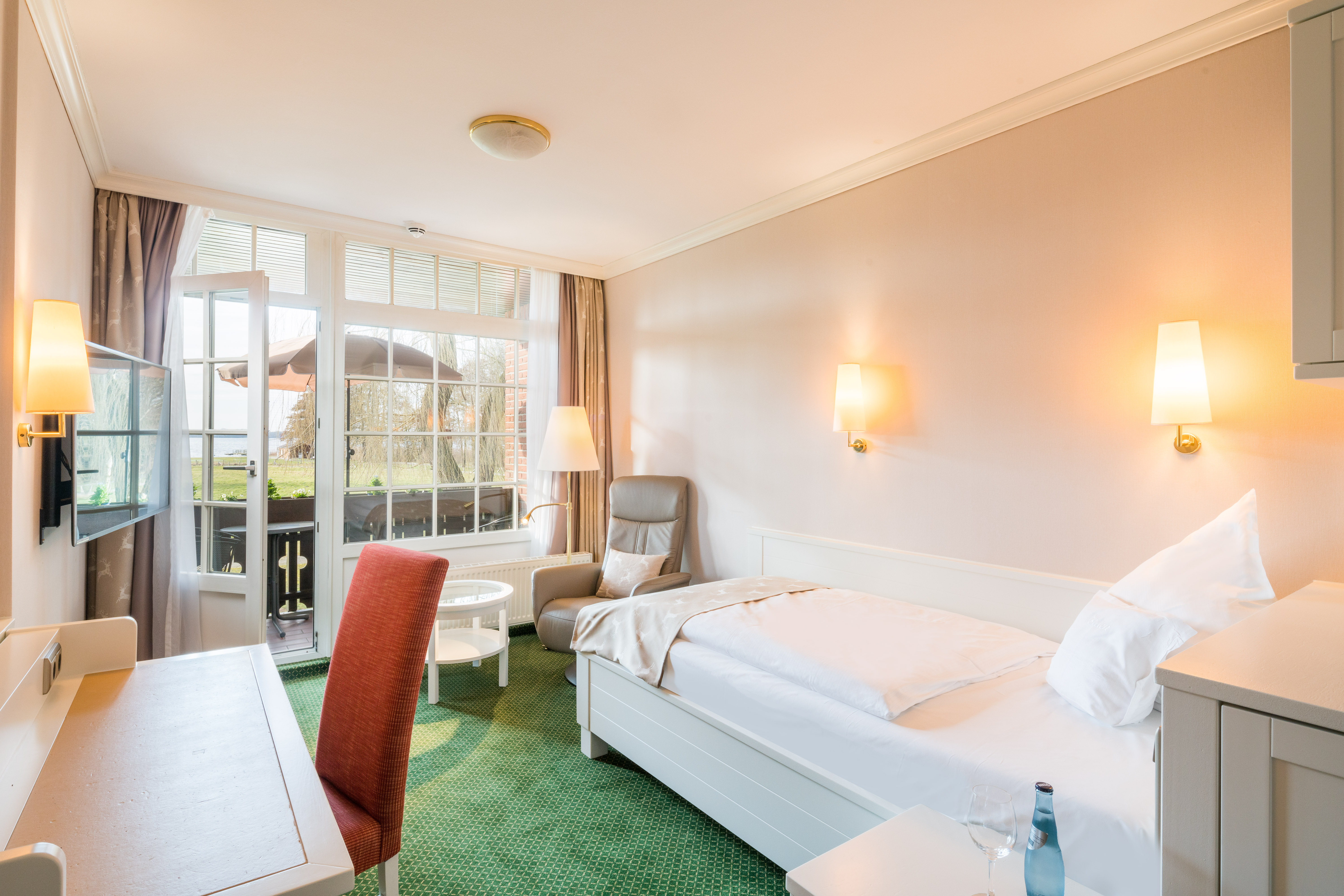 Diese gemütlichen Einzelzimmer, 23-26 qm, liegen teilweise zur Gartensüdseite, zum begrünten Innenbereich oder zur Seeseite. Sie befinden sich im Parterre oder in der 1. Etage. Sie sind ausgestattet mit Sitzbereich und mit Balkon oder Terrasse.