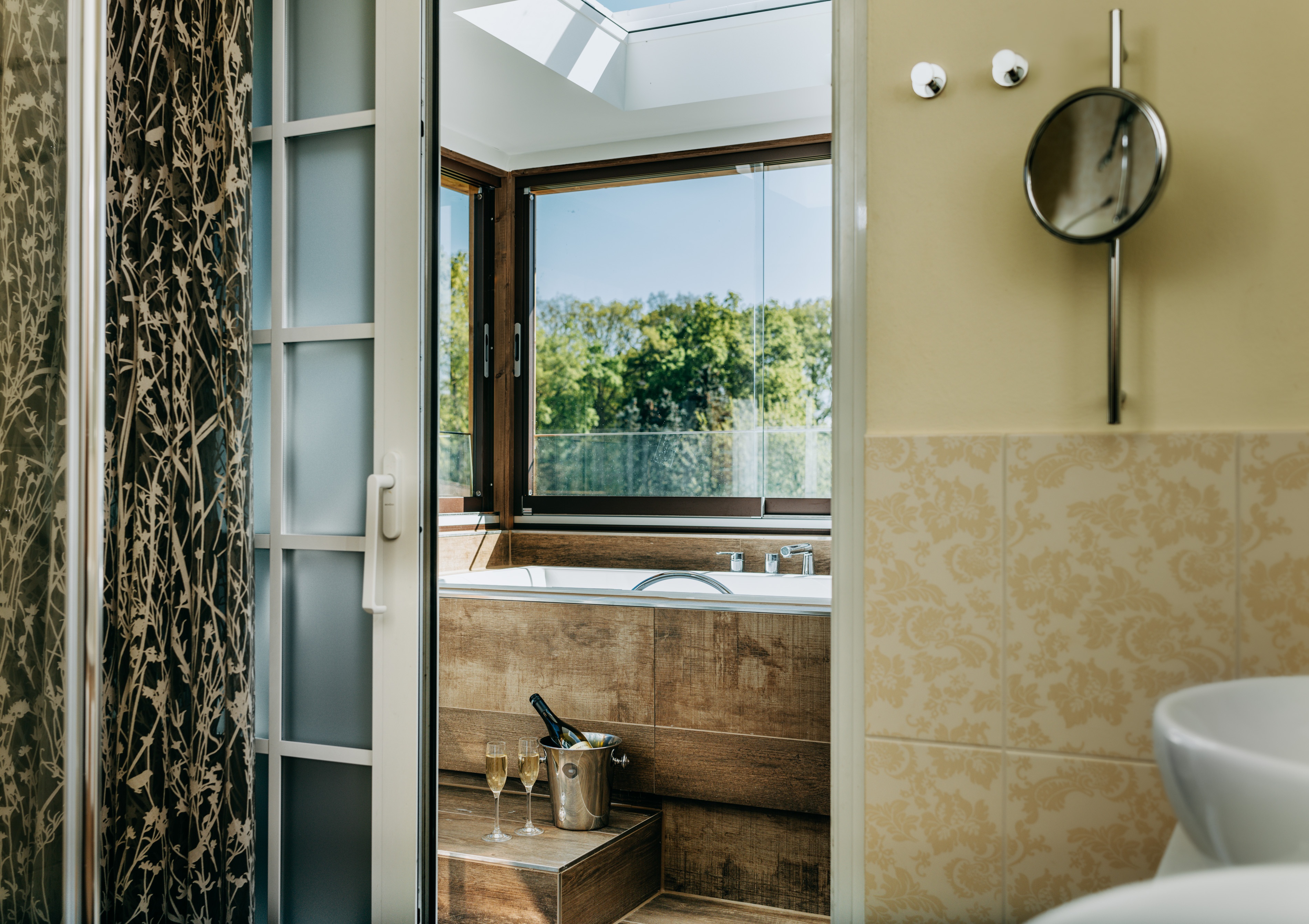 Unsere Wellness Suite über dem Spabereich mit 75 qm in der 2. Etage verfügt über einen traumhaften Blick auf die Gartensüdseite mit Blick auf den Park und die Wiesen.